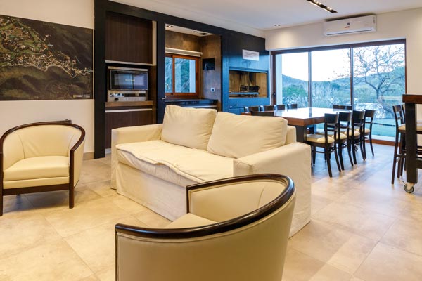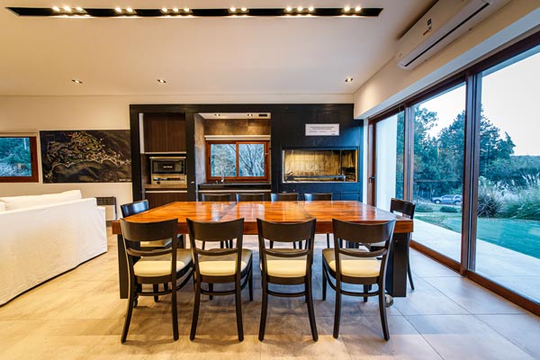 Este exclusivo quincho comedor es un ambiente ideal para reuniones y momentos compartidos. Equipado con una parrilla interior, horno pizzero empotrado, disco, barra con bacha y una amplia mesa para diez comensales, aire acondicionado frío calor y calefactores, está pensado para disfrutar de asados y encuentros en total comodidad. Desde el quincho comedor, una gran abertura vidriada conecta directamente con el parque y el entorno natural. Al salir, los huéspedes se encuentran con un espacio verde cuidadosamente diseñado que incluye un putting green privado, ideal para practicar el juego corto o simplemente disfrutar al aire libre.