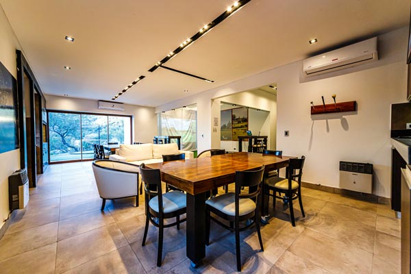 Este amplio espacio, moderno y luminoso, ofrece un equilibrio perfecto entre funcionalidad, confort y diseño contemporáneo. La zona está diseñada en planta abierta, lo que brinda amplitud visual y permite una circulación fluida entre los sectores. El living cuenta con un cómodo sofá central, dos sillones individuales de diseño y una disposición pensada para el descanso o la reunión o simplemente para ver tv. Un ambiente ideal para relajarte, leer o compartir. En cuanto al Comedor, cuenta con una mesa con capacidad para 6 comensales, con comunicación al sector de quincho. Este último se comunica físicamente a la cocina y al quincho.